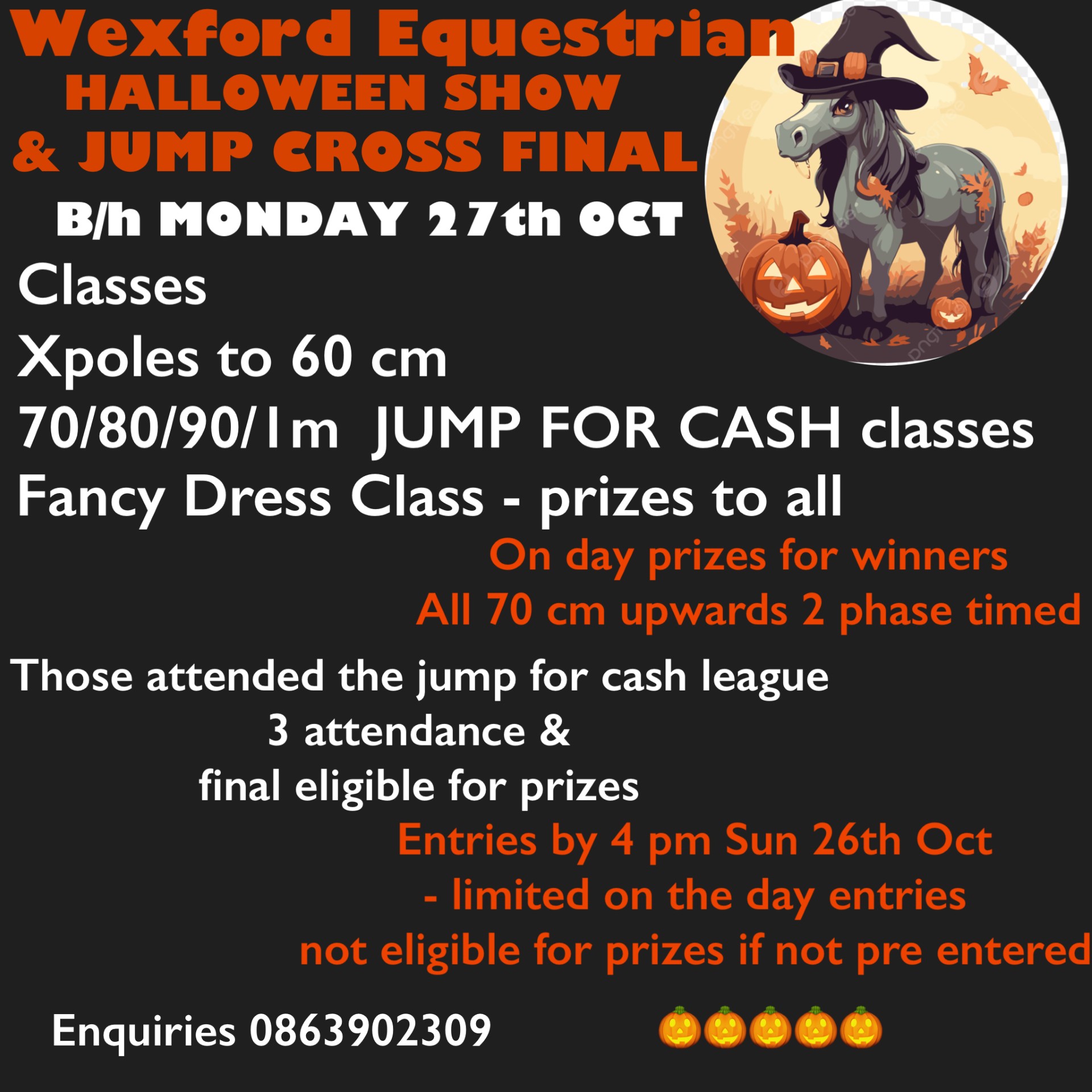 JUMP AT YOUR USUAL HEIGHT OR ABOVE IN CLASSES PLEASE – ENTER AS MANY HORSES OR CLASSES AS YOU WISH