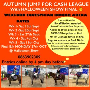 70 UPWARDS – JUMP FOR CASH AT QUALIFIERS – €3 EACH ENTRY TO PRIZE FUND IN THAT CLASS – 1-3RD PRIZE FUND AT FINAL AND ROSETTES 1-6TH